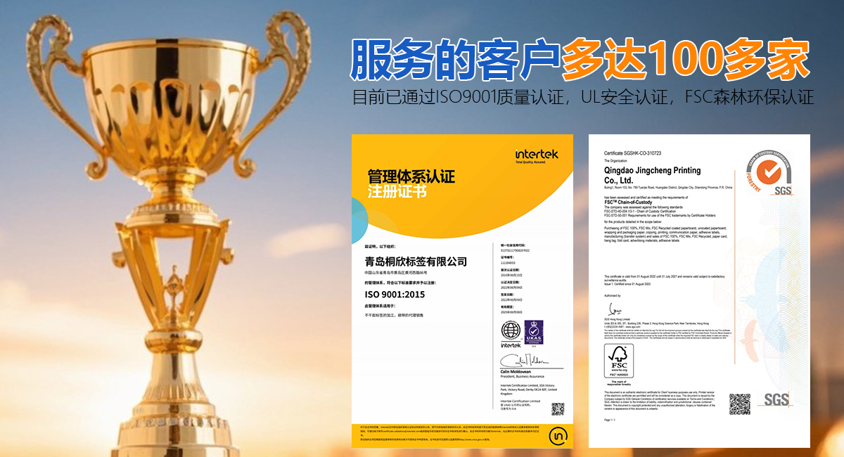 于2006年成立,位于青岛市黄岛区黄河西路86号。我司专业生产各种卷筒不干胶标签,工业标签,药品标签,日化标签,食品标签,轮胎标签等不干胶标签产品的印刷生产。截止目前拥有日本琳得科轮转机2台,国产轮转机2台,商标机2台,模切机6台,全自动检标机1台,分条机3台。产能每年可生产300万平方不干胶标签,服务的客户海尔、海信、等多达100多家,我司目前已通过ISO9001质量认证,UL安 全认证,FSC森林环保认证,公司拥有ERP管理系统,能够更好的进行订单,生产,库存等管理。